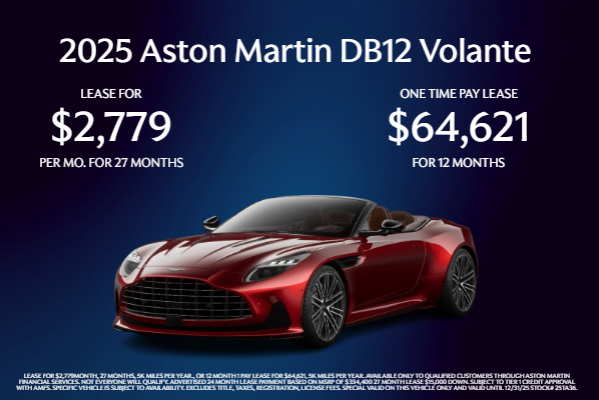 LEASE FOR $2,599MONTH, 27 MONTHS, 5K MILES PER YEAR., or 12 Month 1 Pay Lease for $63,564, 5K Miles Per Year. Available only to qualified customers through Aston Martin financial services. Not everyone will qualify. Advertised 24 month lease payment based on MSRP of $263,500. 27 month lease $5,000 down. Subject to Tier 1 credit approval with AMFS. Specific vehicle is subject to availability. Excludes title, taxes, registration, license fees. Special valid on this vehicle only and valid until 2/28/26. Stock# 25TA36