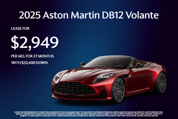 LEASE FOR $2,949/MONTH, 27 MONTHS, 5K MILES PER YEAR. AVAILABLE ONLY TO QUALIFIED CUSTOMERS THROUGH ASTON MARTIN FINANCIAL SERVICES. NOT EVERYONE WILL QUALIFY. ADVERTISED 27 MONTH LEASE PAYMENT BASED ON MSRP OF $334,400 WITH $33,400 DOWN. SUBJECT TO TIER 1 CREDIT APPROVAL WITH AMFS. SPECIFIC VEHICLE IS SUBJECT TO AVAILABILITY. EXCLUDES TITLE, TAXES, REGISTRATION, LICENSE FEES. SPECIAL VALID ON THIS VEHICLE ONLY AND VALID UNTIL 3/31/26. STOCK# 25TA36