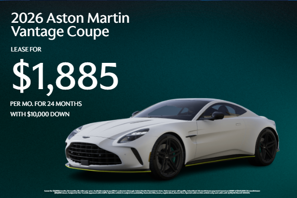 LEASE FOR $1,885/MONTH, 24 MONTHS, 5K MILES PER YEAR. Available only to qualified customers through Aston Martin financial services. Not everyone will qualify. Advertised 24 month lease payment based on MSRP of $243,500 24 month lease $10,000 down. Subject to Tier 1 credit approval with AMFS. Specific vehicle is subject to availability. Excludes title, taxes, registration, license fees. Special valid on this vehicle only and valid until 4/30/26 Stock# 26TA03.